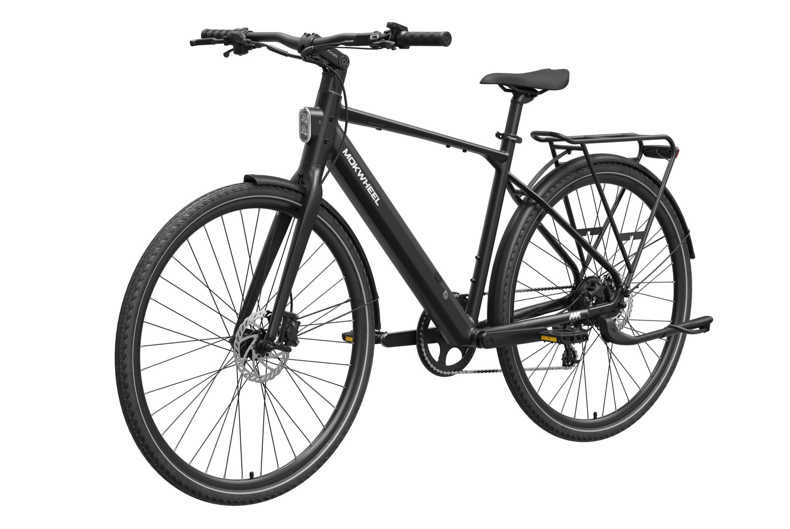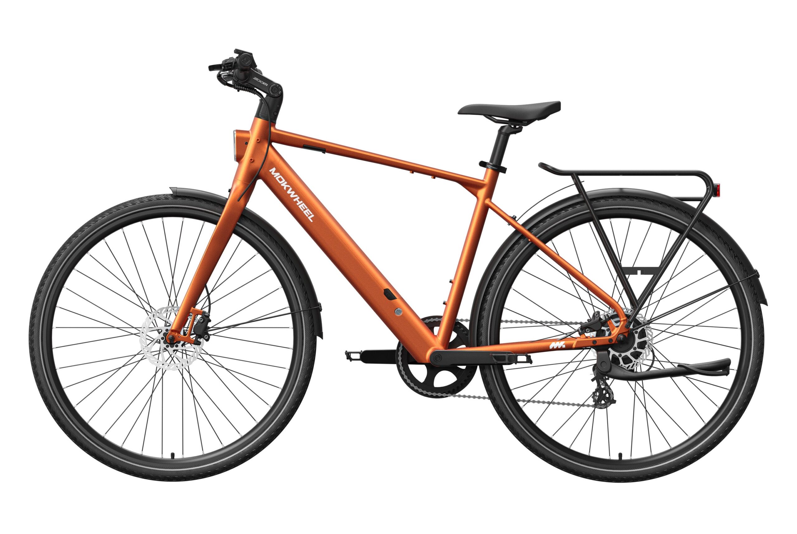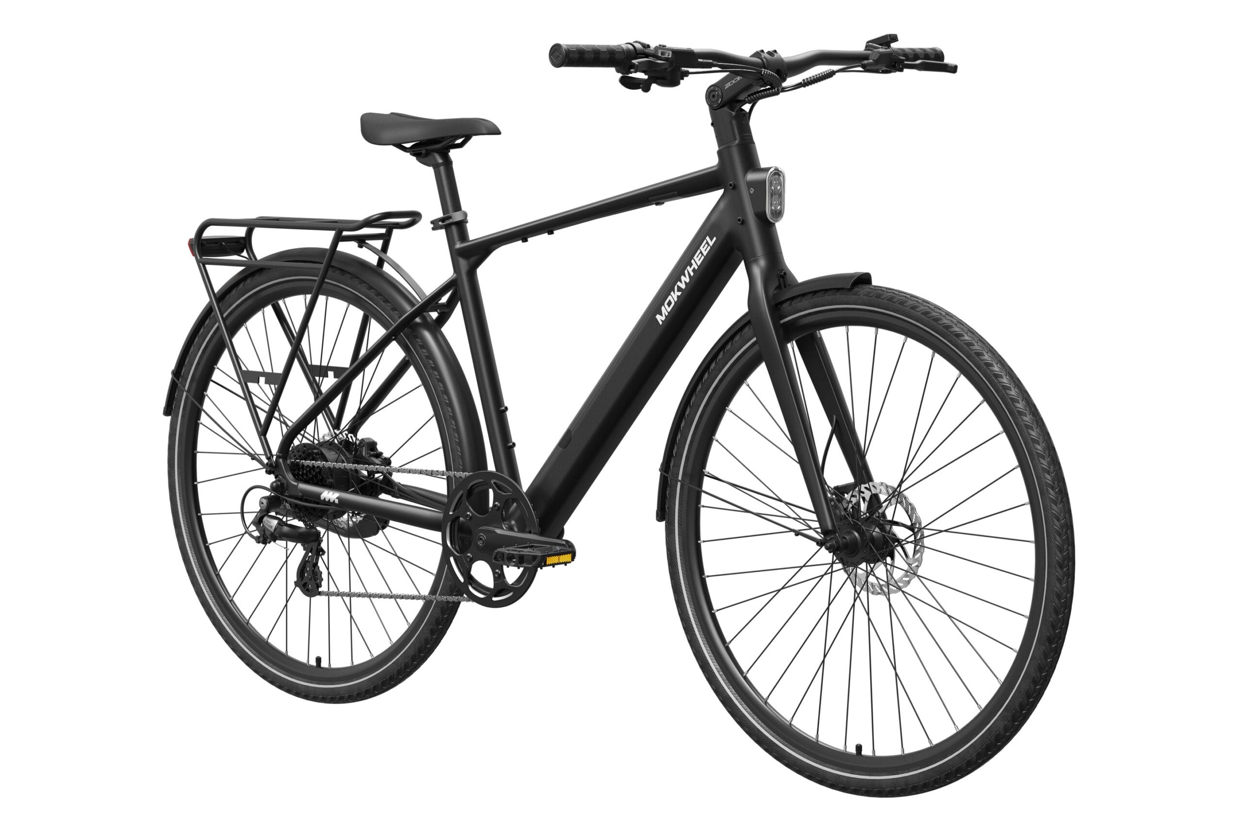 Mokwheel FLINT: A lightweight urban commuter eBike with a 550W peak motor and 40Nm torque, weighing just 36 lbs. Features a 36V 10Ah battery for up to 70 miles of range and efficient CST 700?45C tires. Equipped with torque & cadence sensors, a Shimano 8-speed drivetrain, Logan hydraulic brakes, and a 350 lbs payload capacity for agile, reliable city riding.