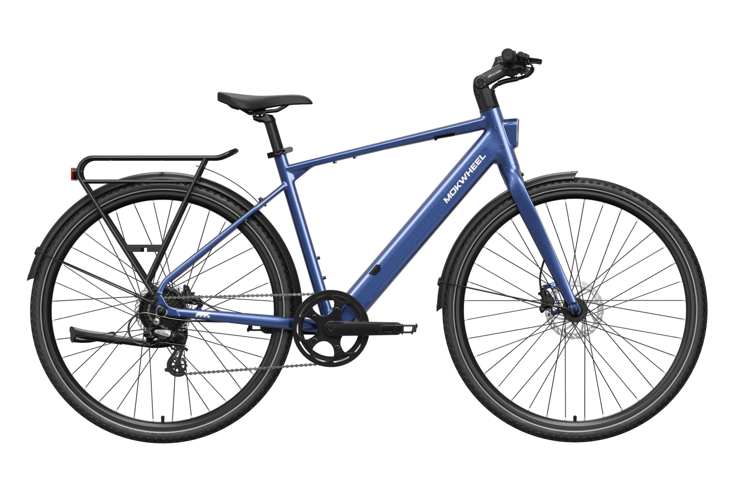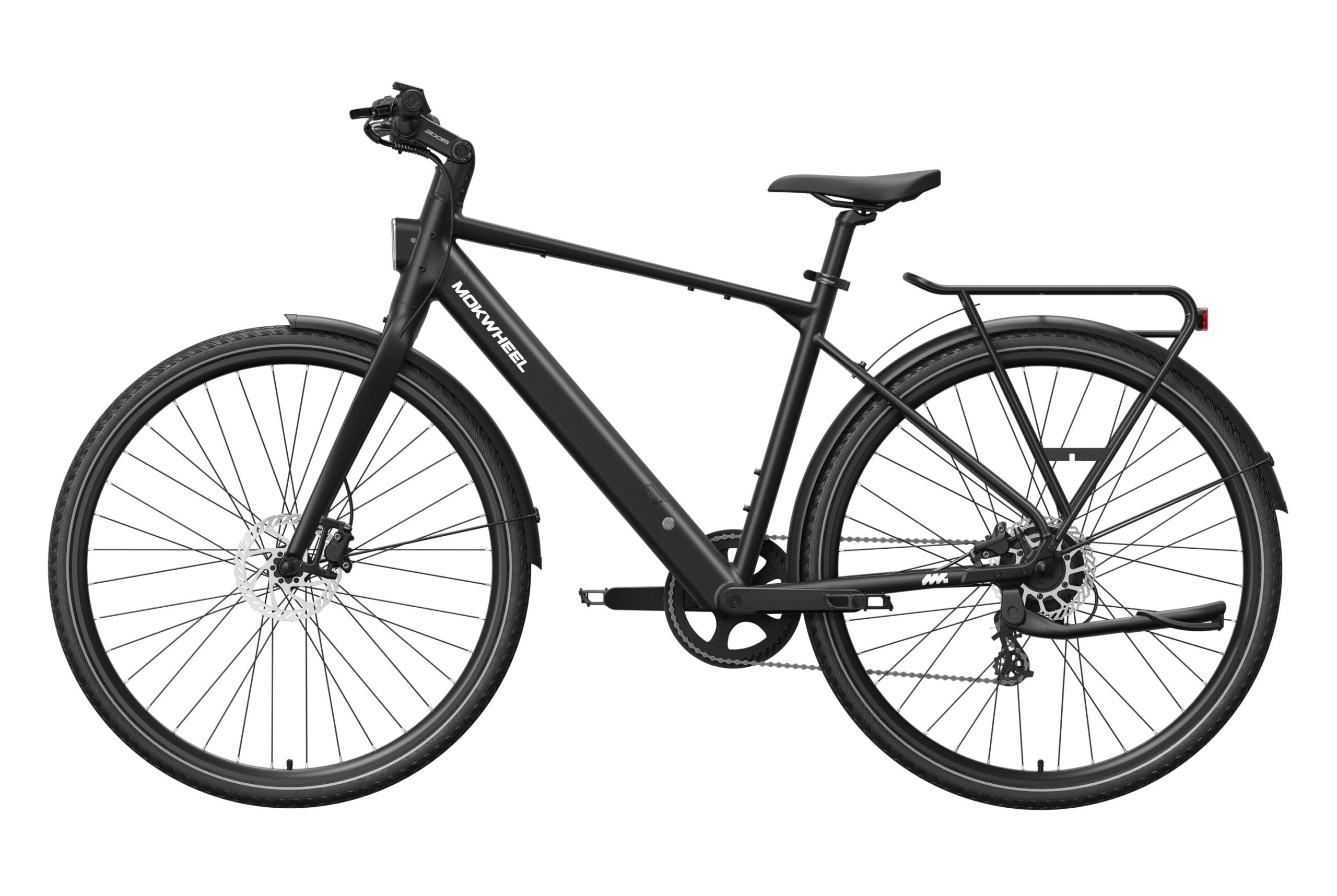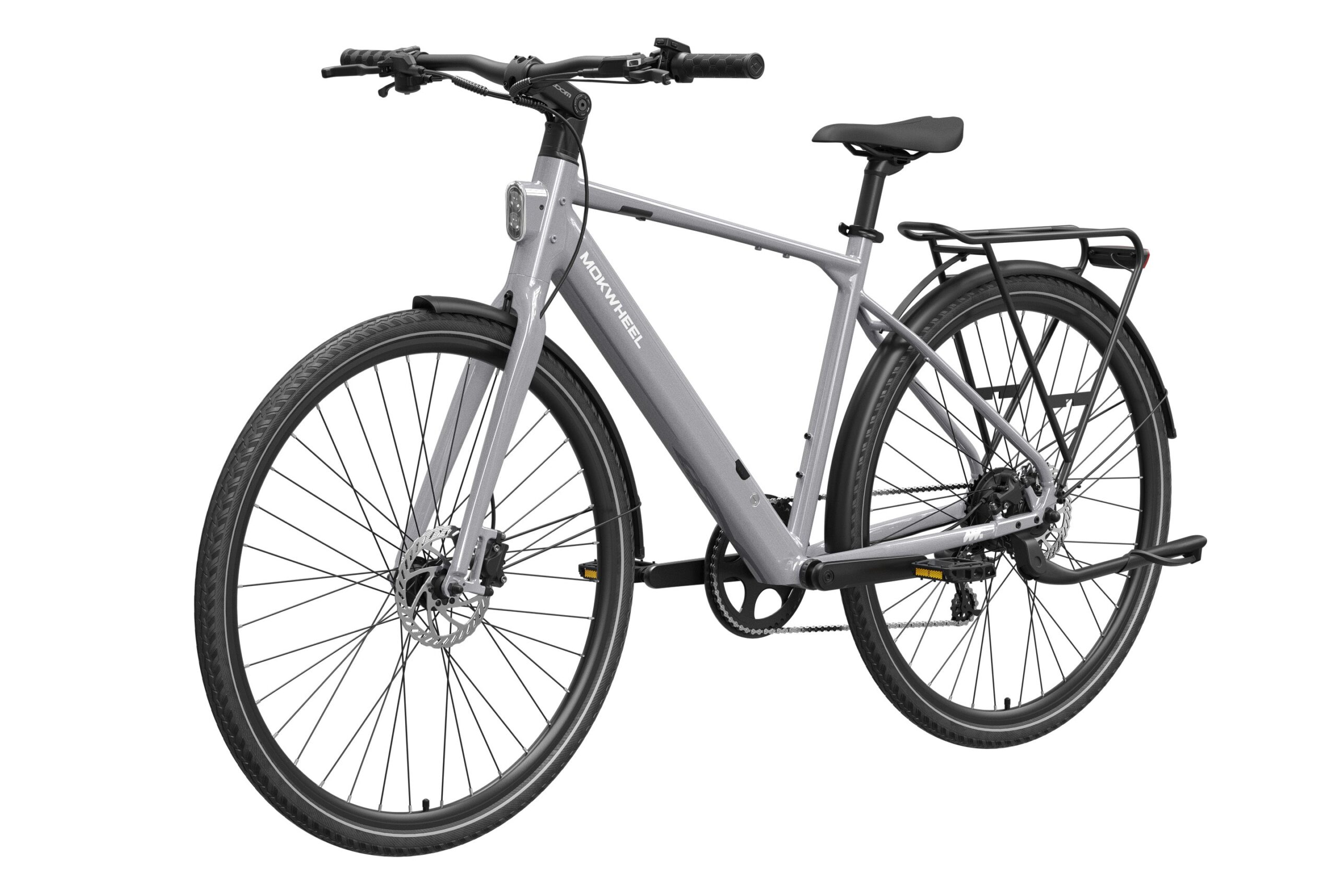 Mokwheel FLINT: A lightweight urban commuter eBike with a 550W peak motor and 40Nm torque, weighing just 36 lbs. Features a 36V 10Ah battery for up to 70 miles of range and efficient CST 700?45C tires. Equipped with torque & cadence sensors, a Shimano 8-speed drivetrain, Logan hydraulic brakes, and a 350 lbs payload capacity for agile, reliable city riding.