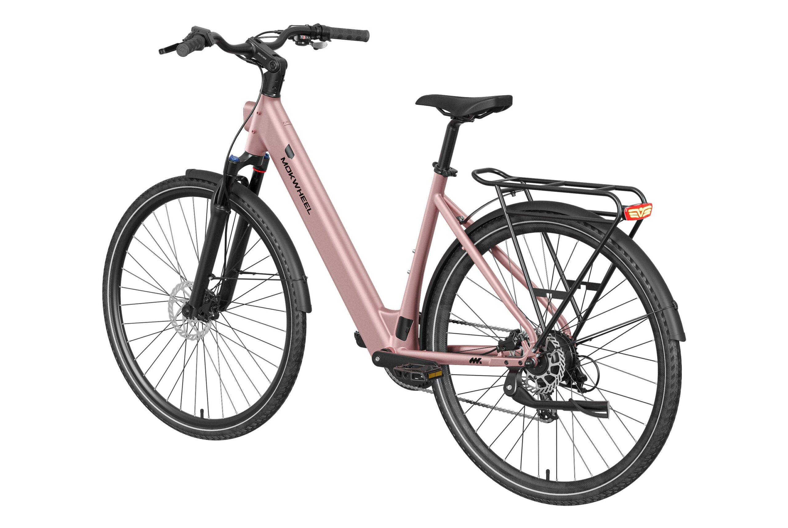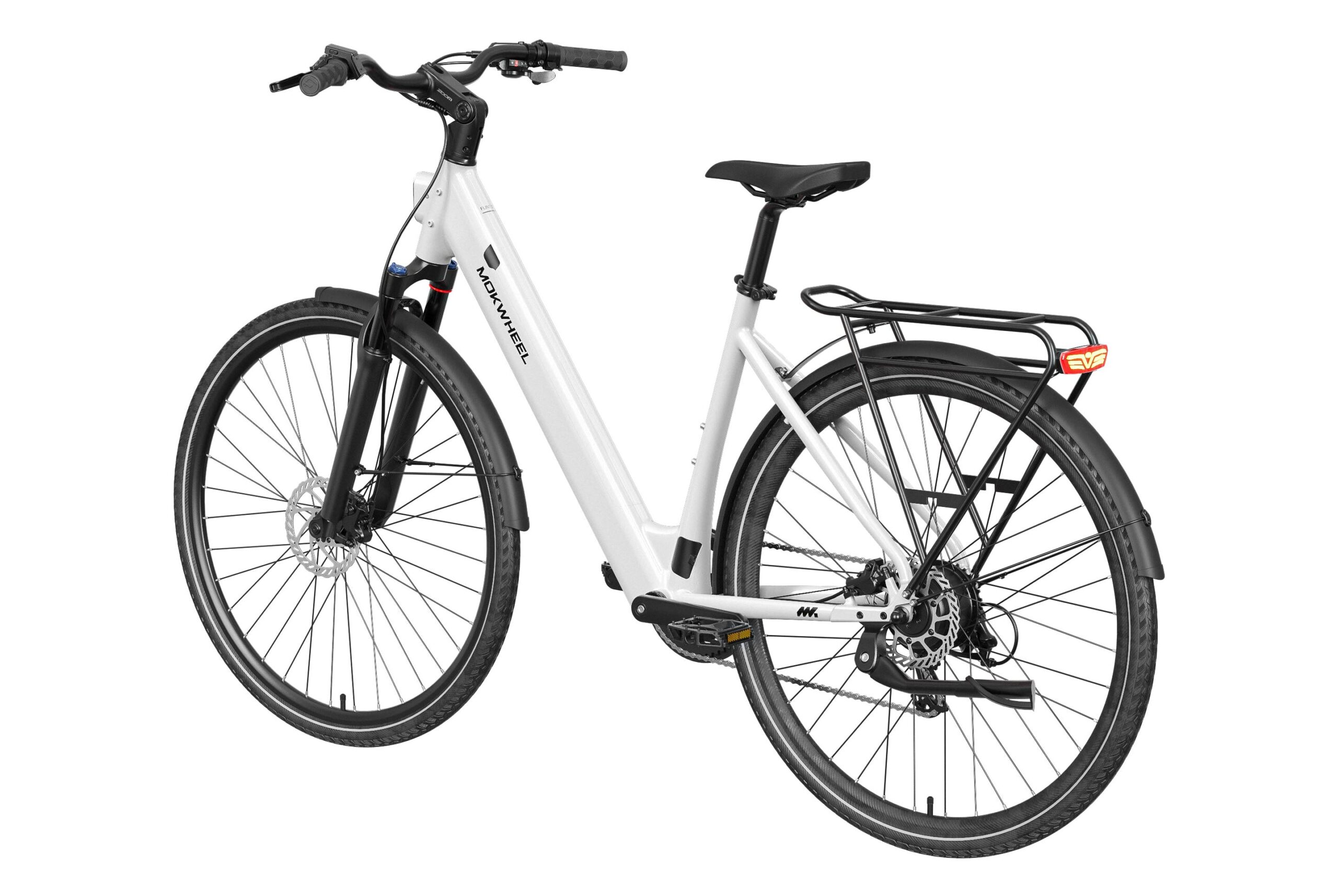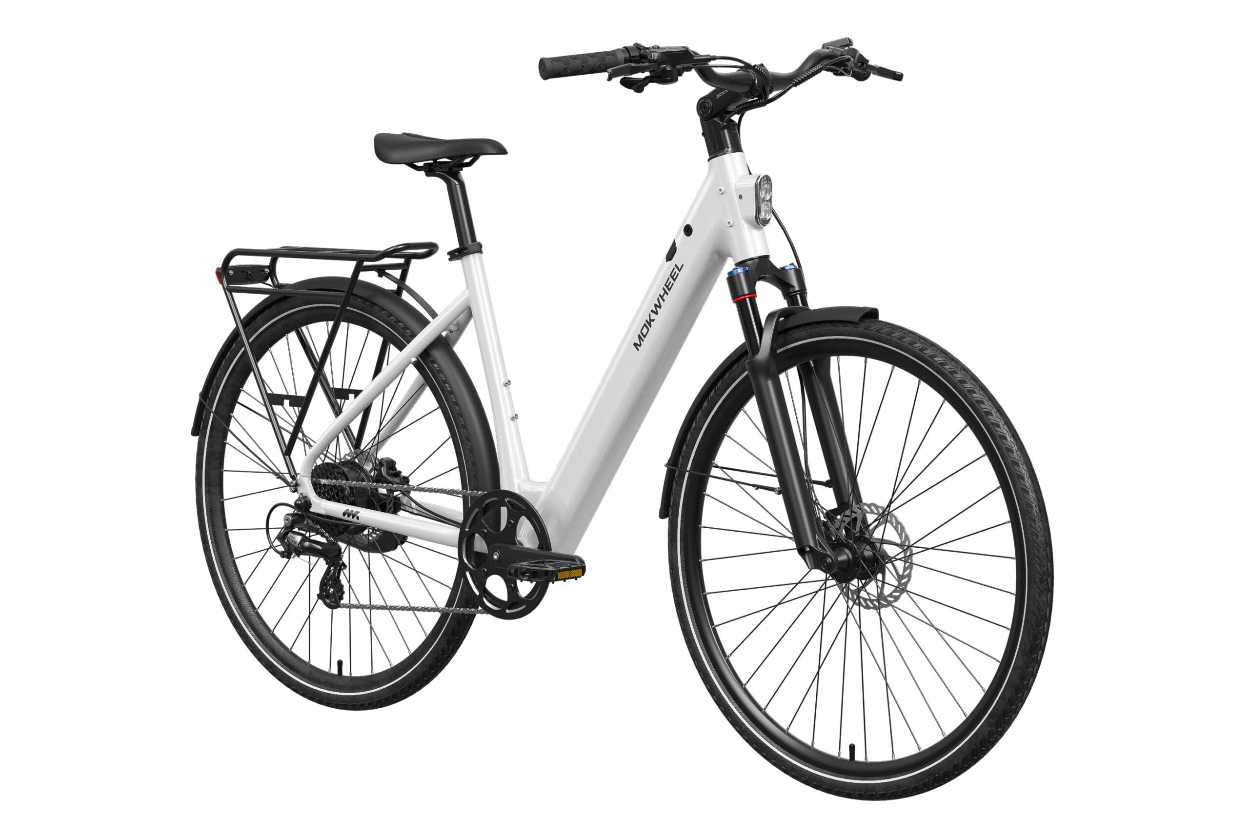 Mokwheel FLINT ST: A lightweight step-through urban commuter with a 550W peak motor and 40Nm torque. Features a 36V 10Ah battery for up to 70 miles of range and efficient CST 700?45C tires. Equipped with torque & cadence sensors, a 65mm adjustable suspension fork, Shimano 8-speed drivetrain, Logan hydraulic brakes, and a comfortable low-step frame for relaxed, confident city riding.