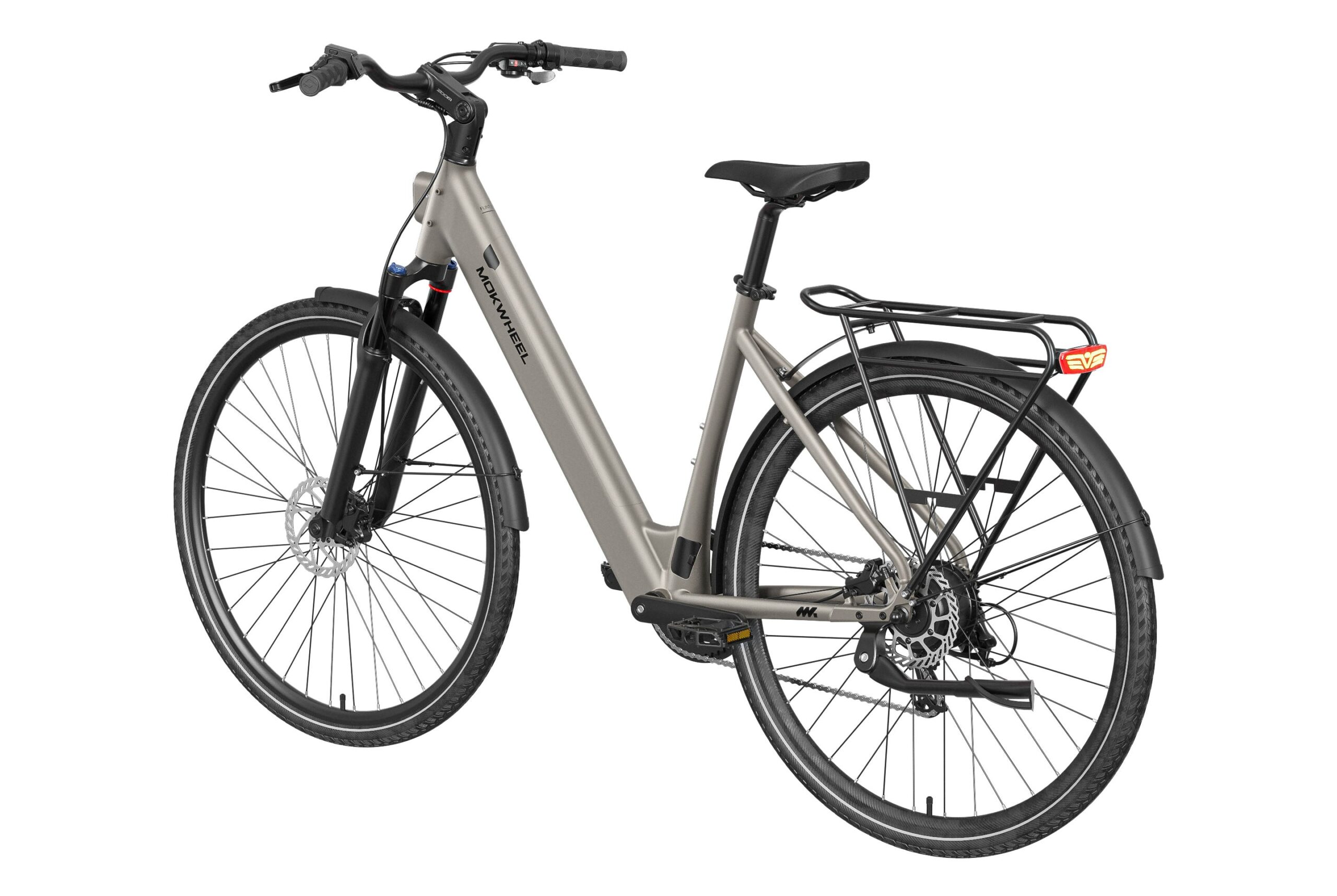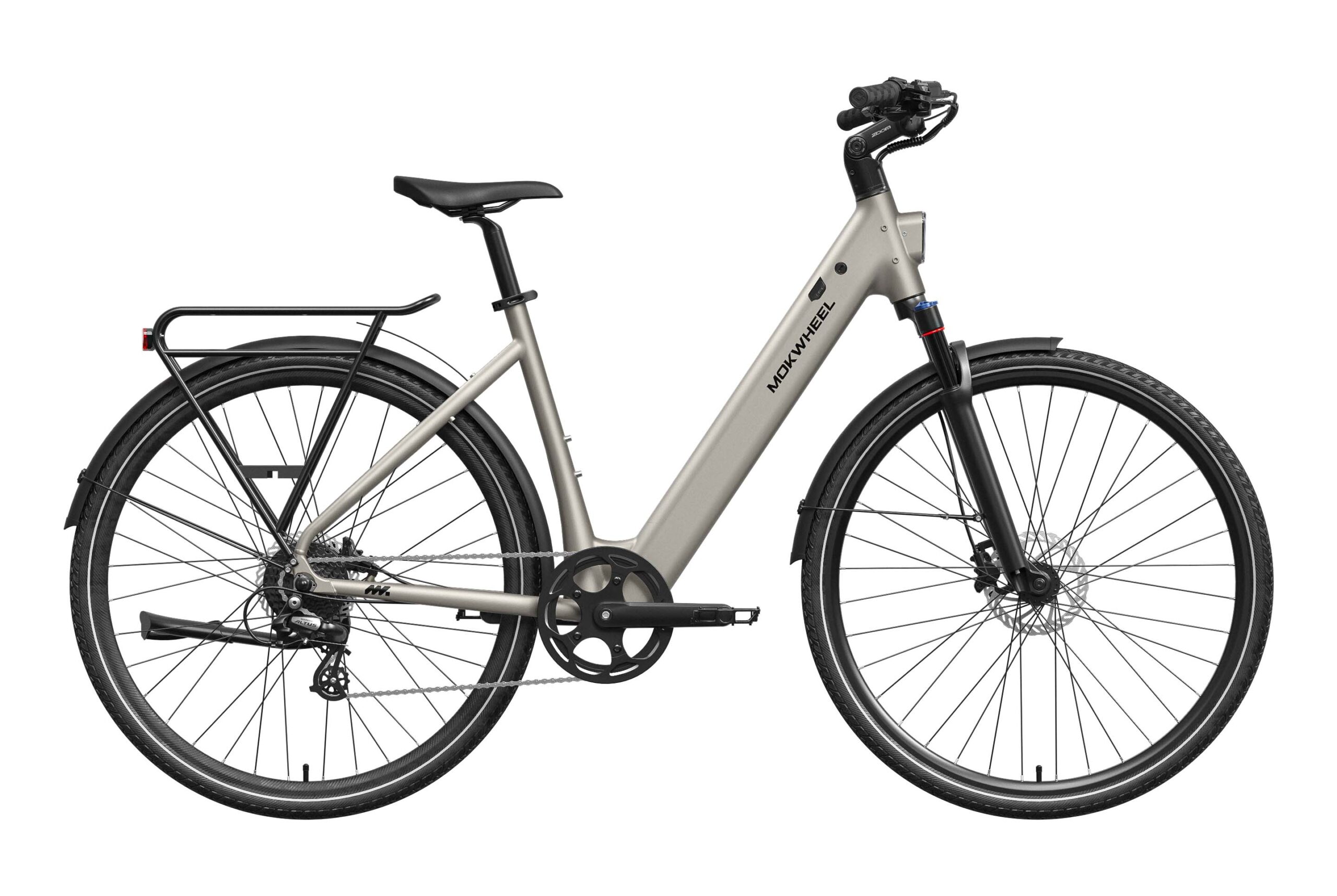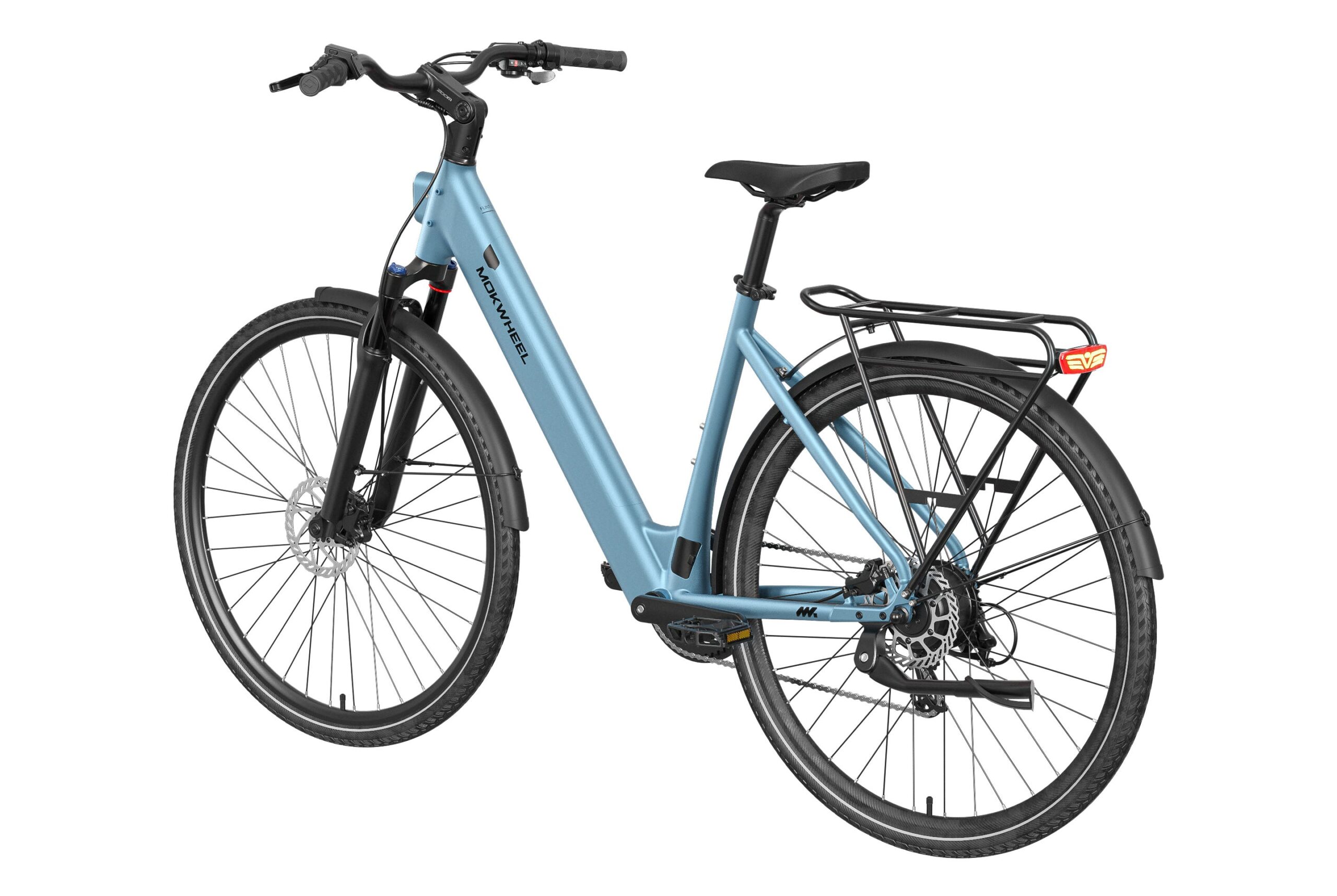 Mokwheel FLINT ST: A lightweight step-through urban commuter with a 550W peak motor and 40Nm torque. Features a 36V 10Ah battery for up to 70 miles of range and efficient CST 700?45C tires. Equipped with torque & cadence sensors, a 65mm adjustable suspension fork, Shimano 8-speed drivetrain, Logan hydraulic brakes, and a comfortable low-step frame for relaxed, confident city riding.