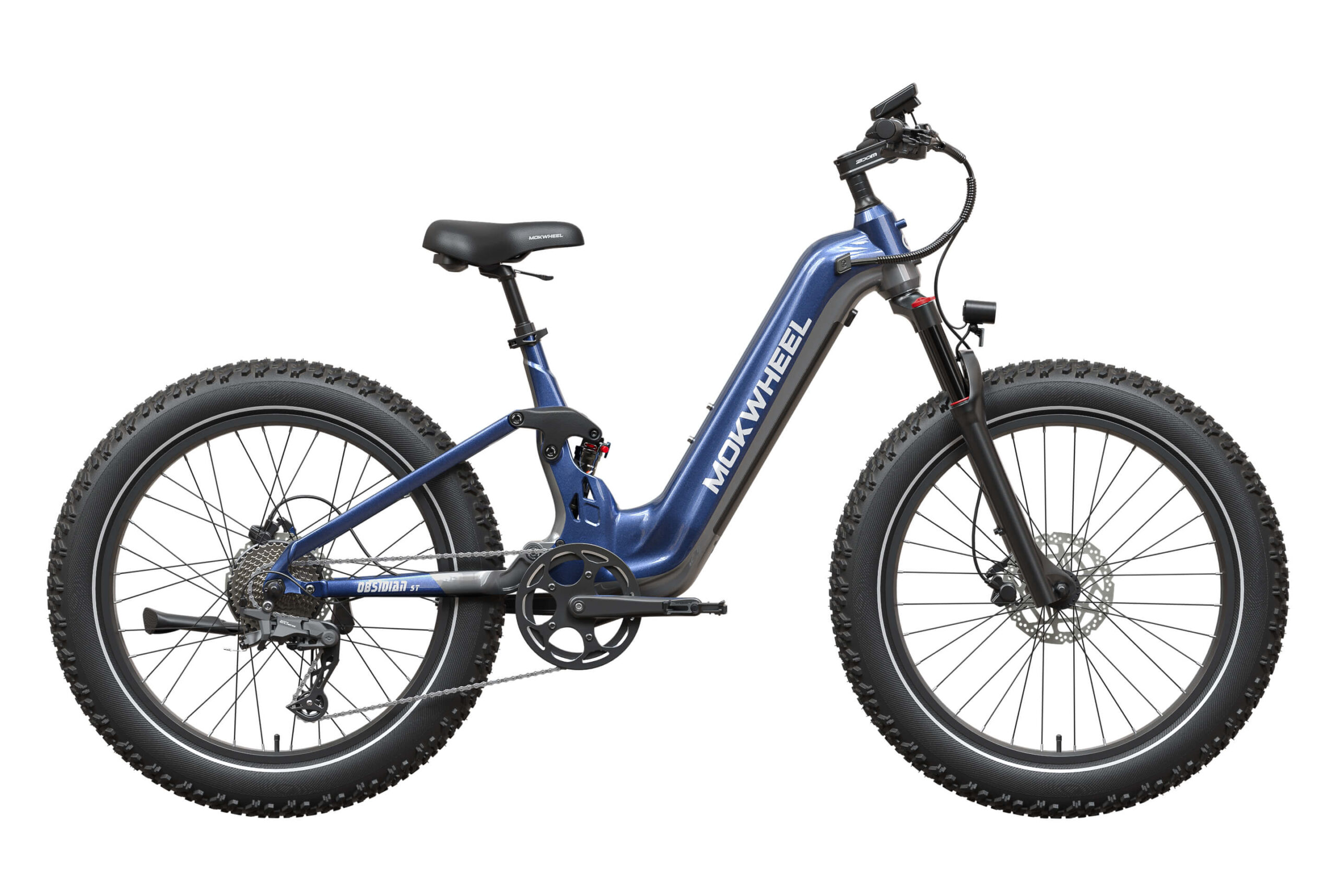 Mokwheel Obsidian ST 2.0: A step-through full-suspension e-mountain bike with a 1300W peak motor and 105Nm+ torque. Features a 48V 19.6Ah battery for up to 80 miles of range and 26″x4.0″ puncture-resistant fat tires. Equipped with dual torque & cadence sensors, 130mm adjustable front suspension, hydraulic disc brakes, a low-step frame, and a 560 lbs payload capacity for versatile trail-to-town riding.