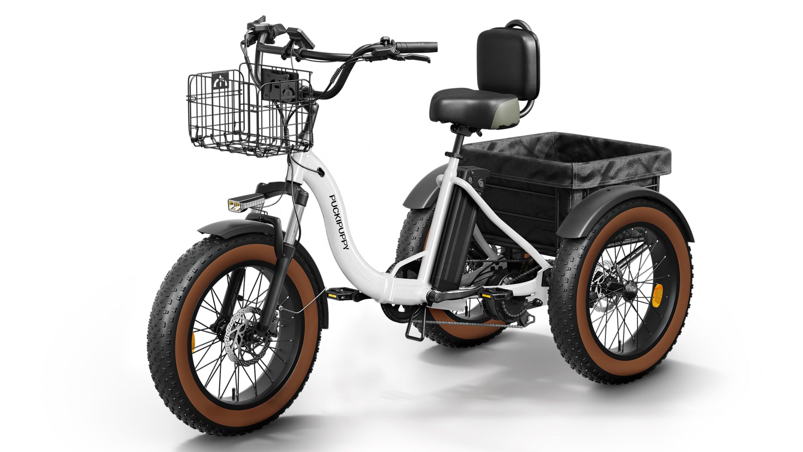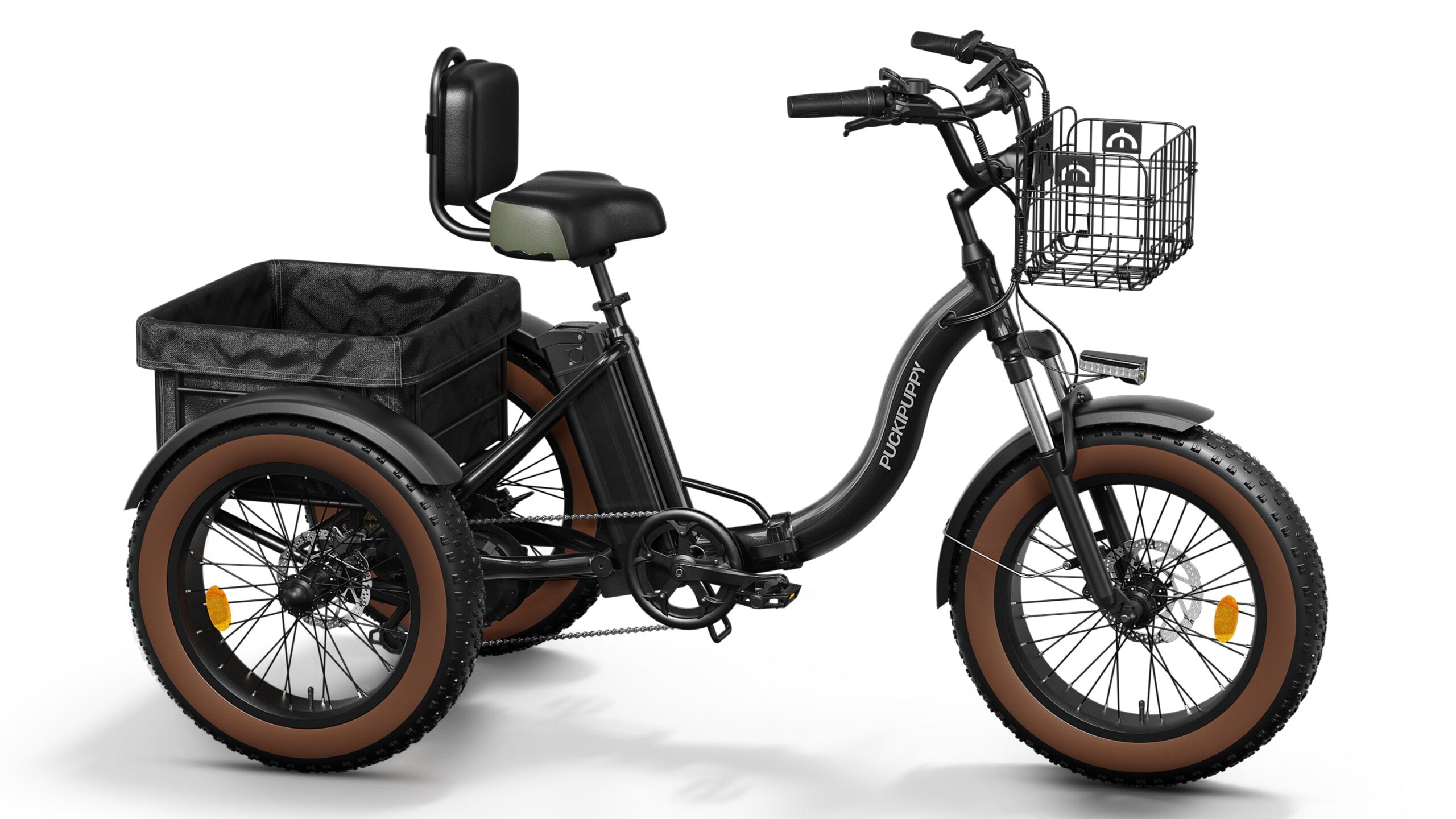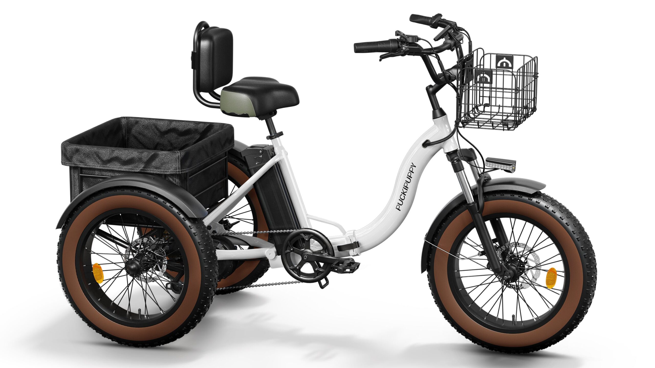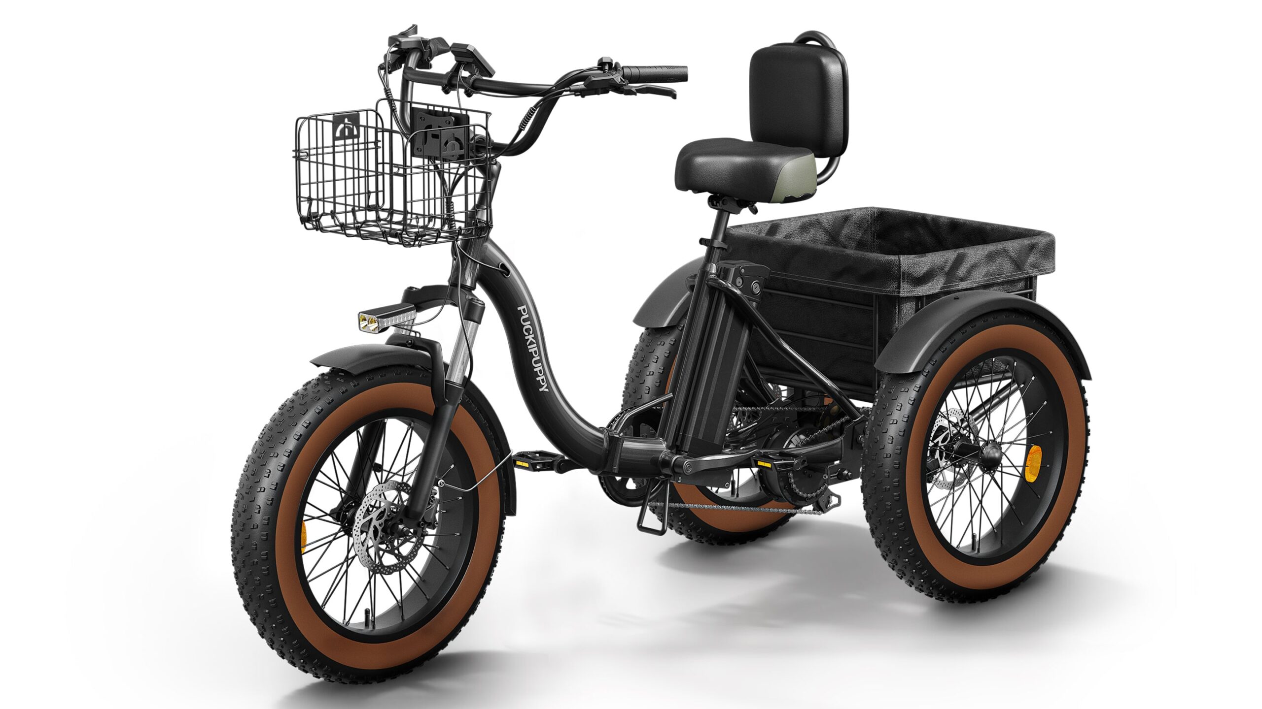 PUCKIPUPPY Alaskan: The electric cargo trike built for ultimate stability and peace of mind. Featuring an advanced rear differential system that actively prevents tipping during turns, a powerful 960W peak motor, and triple hydraulic disc brakes for confident stopping power. With a massive 500 lb load capacity and up to 55 miles of range, it’s the confident choice for hauling cargo safely.
