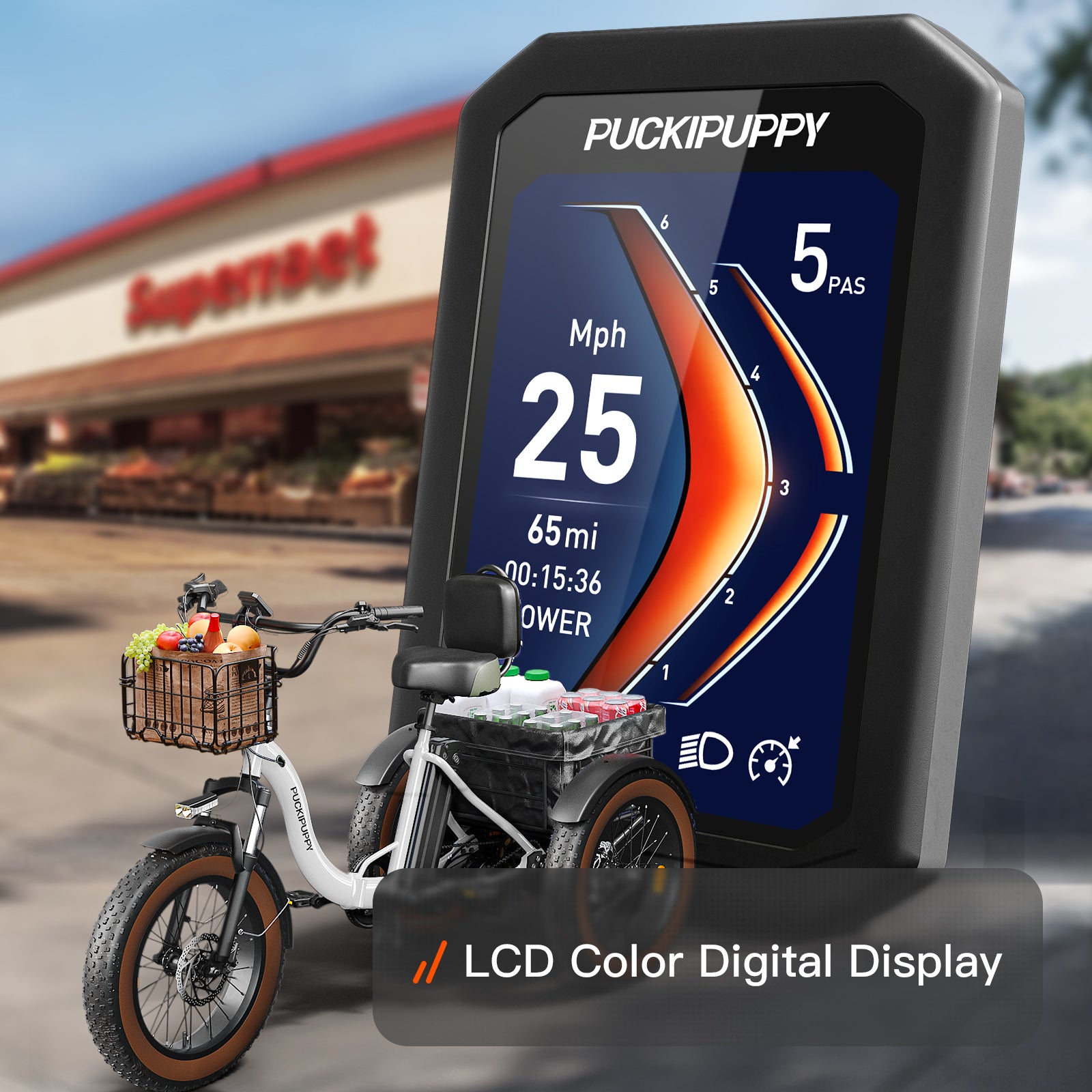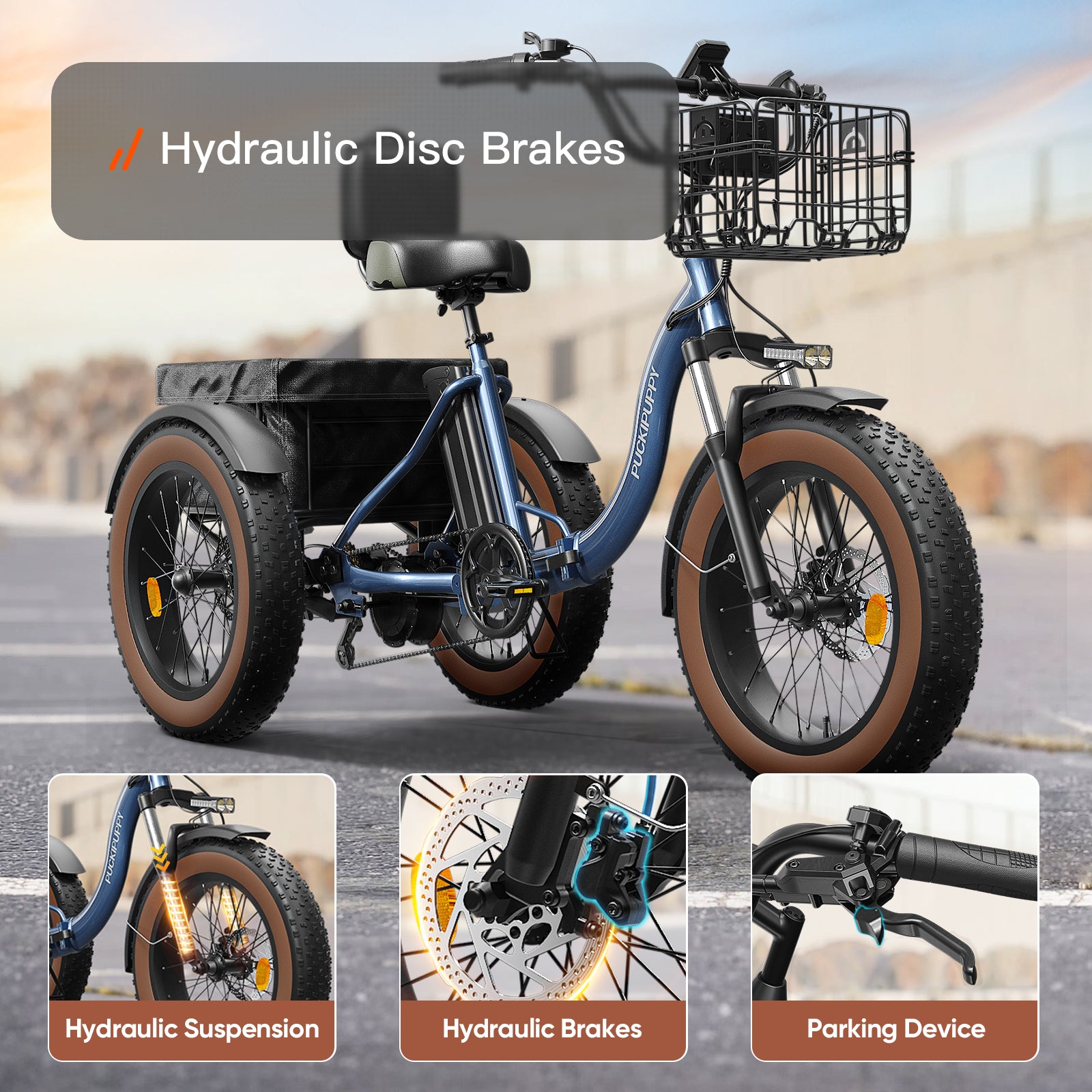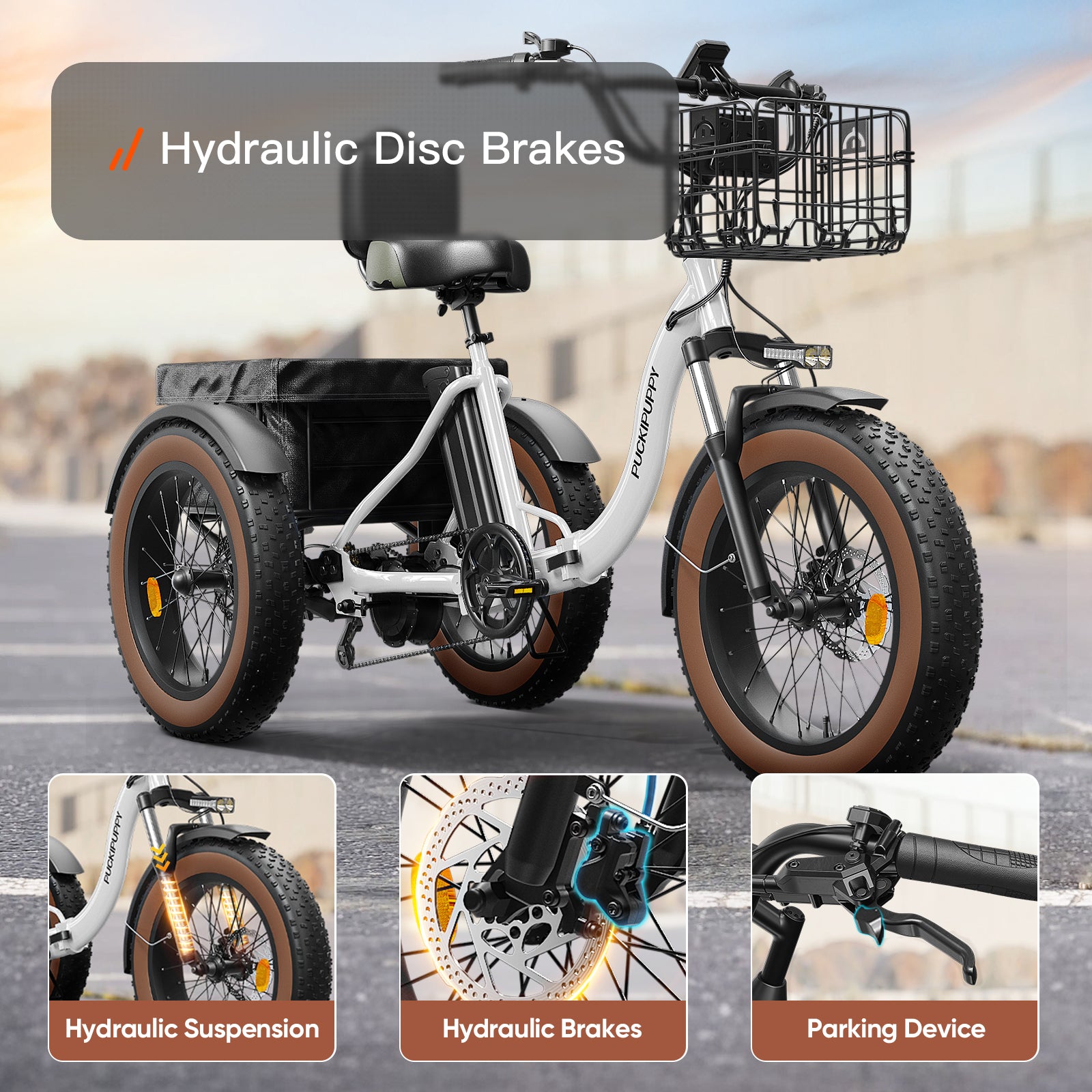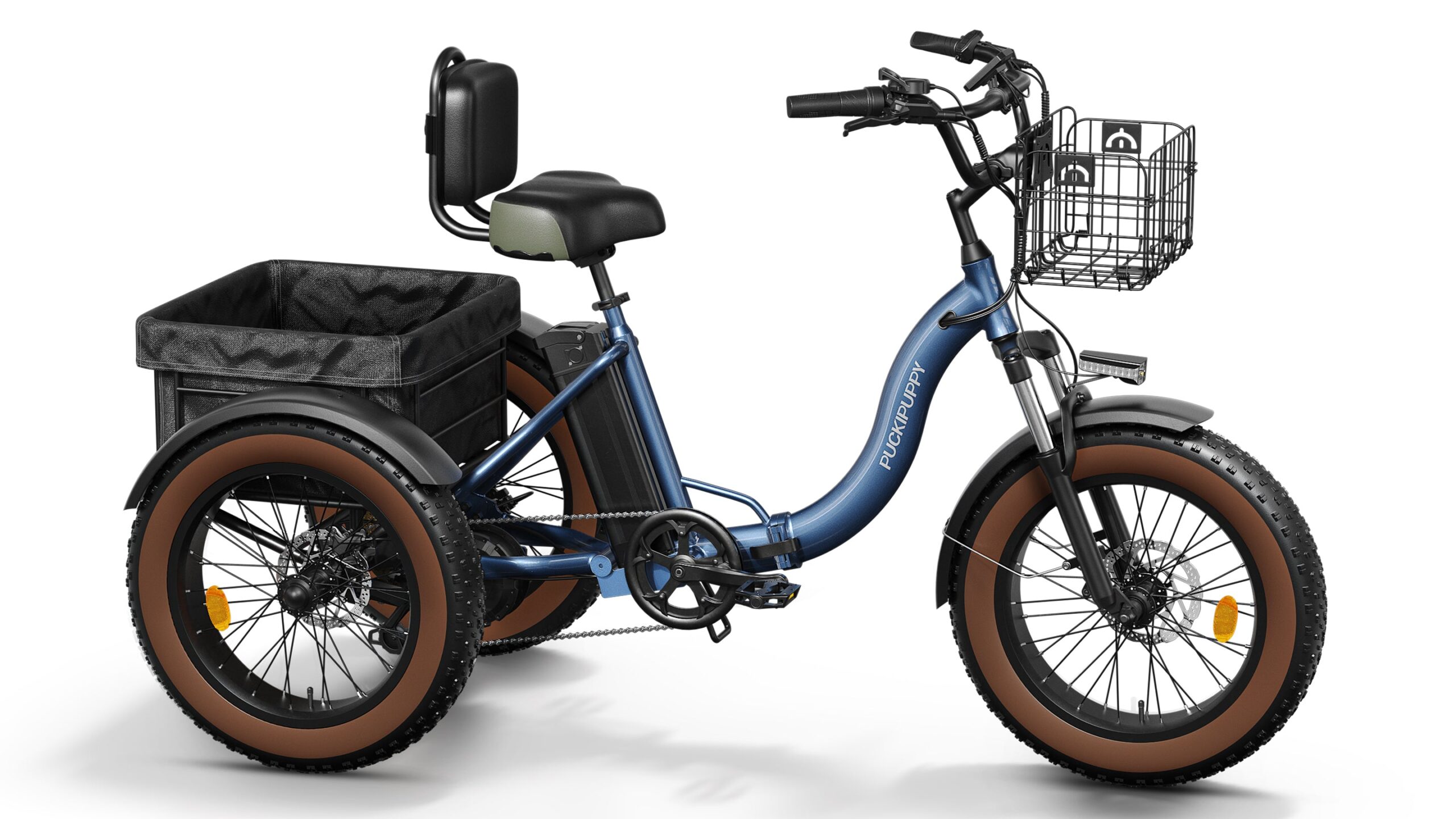PUCKIPUPPY Alaskan: The electric cargo trike built for ultimate stability and peace of mind. Featuring an advanced rear differential system that actively prevents tipping during turns, a powerful 960W peak motor, and triple hydraulic disc brakes for confident stopping power. With a massive 500 lb load capacity and up to 55 miles of range, it’s the confident choice for hauling cargo safely.