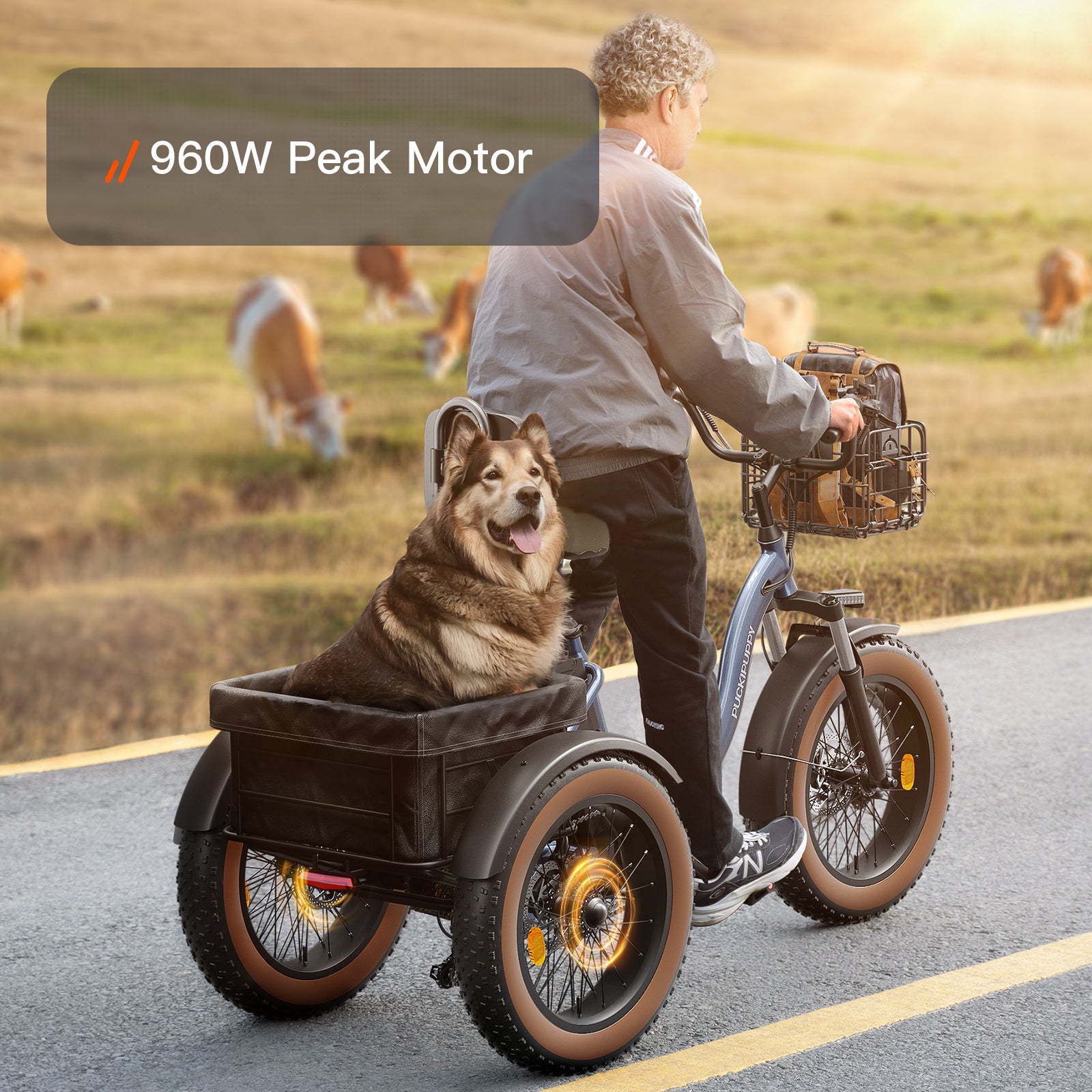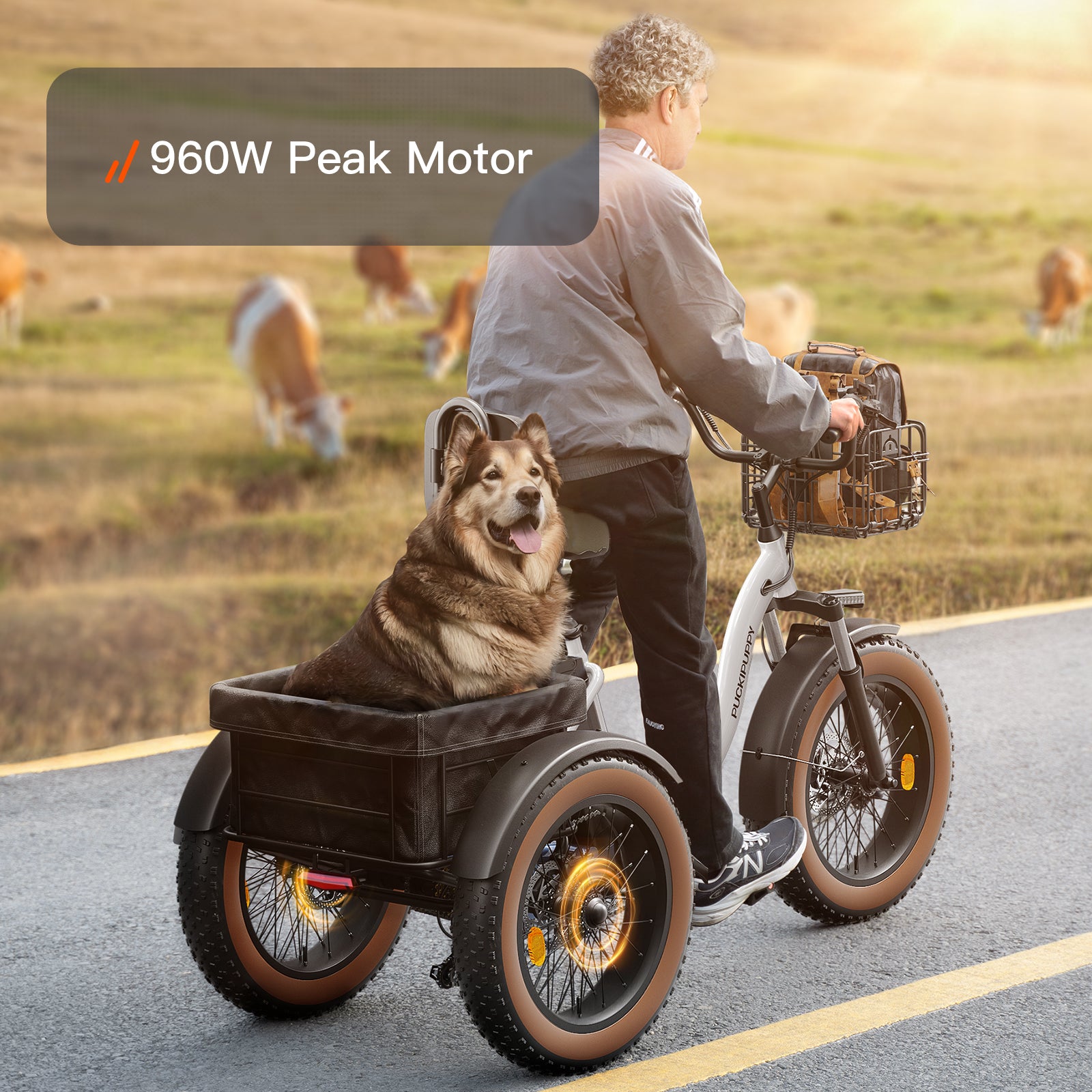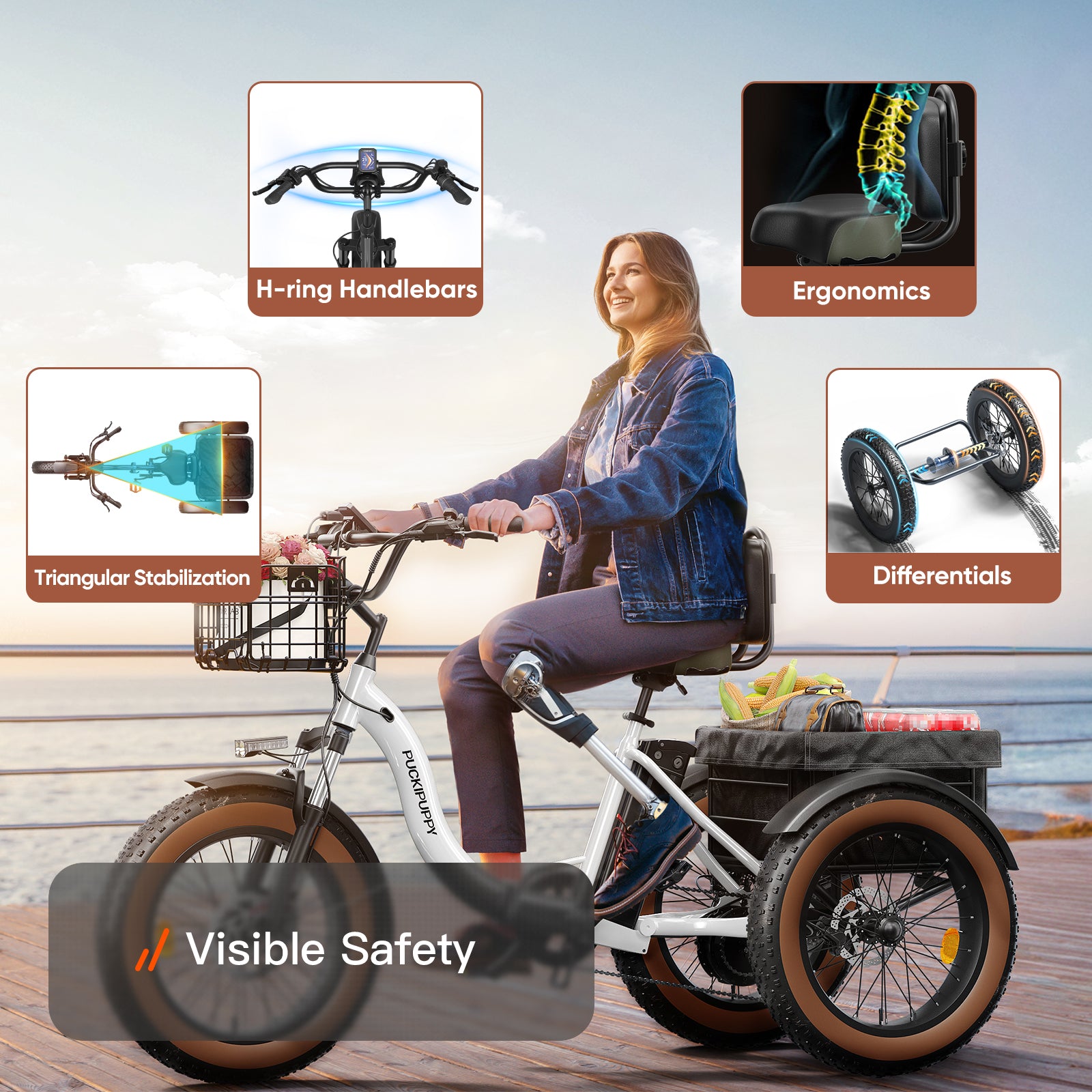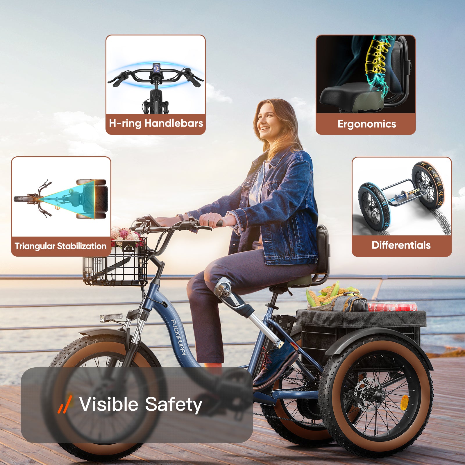 PUCKIPUPPY Alaskan: The electric cargo trike built for ultimate stability and peace of mind. Featuring an advanced rear differential system that actively prevents tipping during turns, a powerful 960W peak motor, and triple hydraulic disc brakes for confident stopping power. With a massive 500 lb load capacity and up to 55 miles of range, it’s the confident choice for hauling cargo safely.