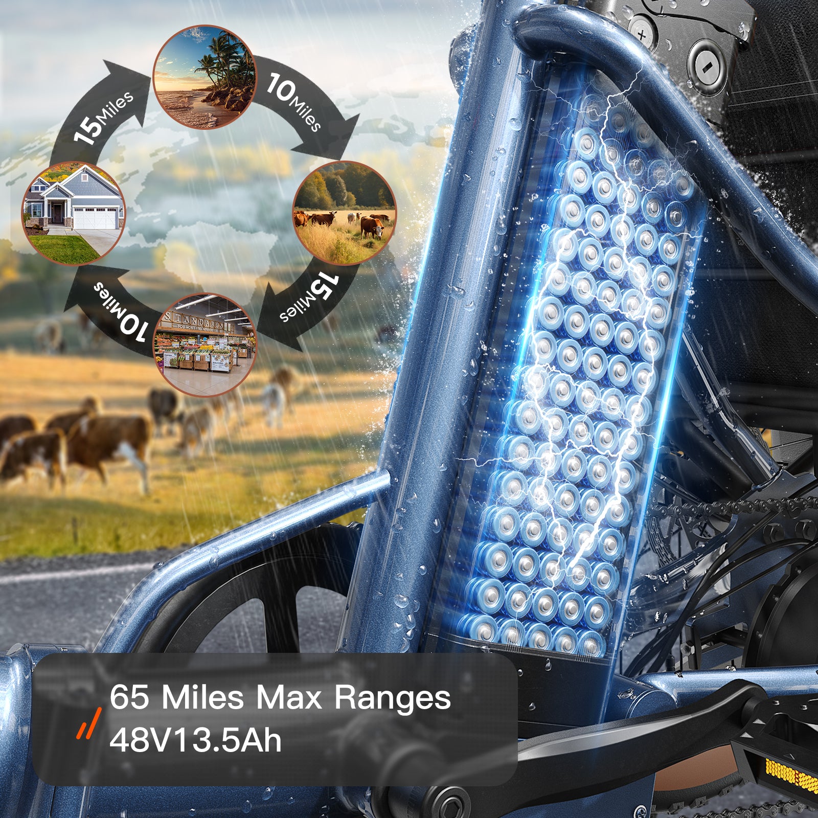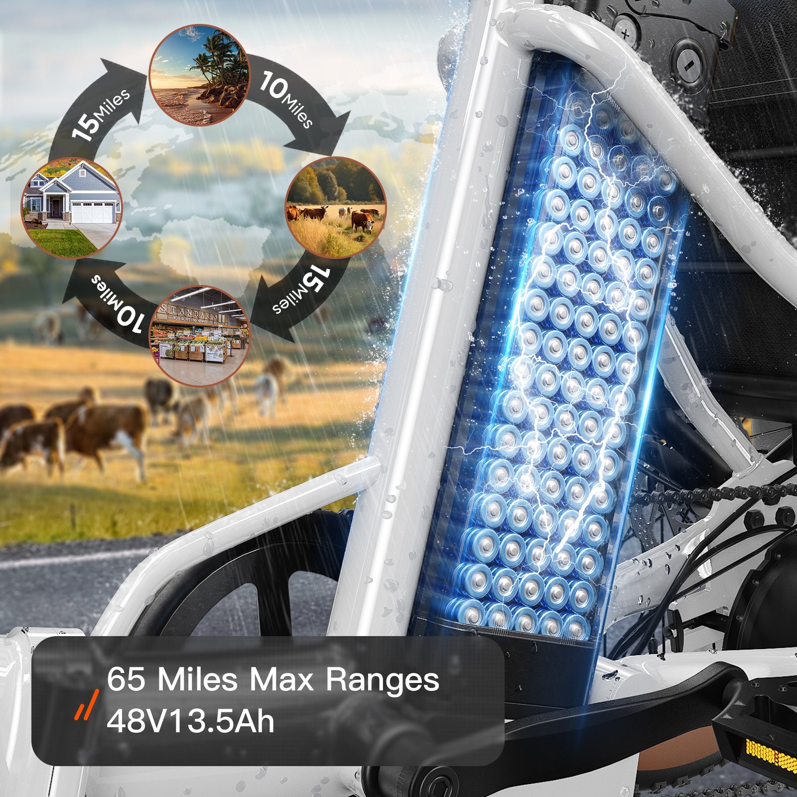 - Long-Range 48V Battery: The high-capacity 48V 13.5Ah battery provides an impressive range of up to 55 miles on a single charge, perfect for daily commutes, errands, or weekend adventures.