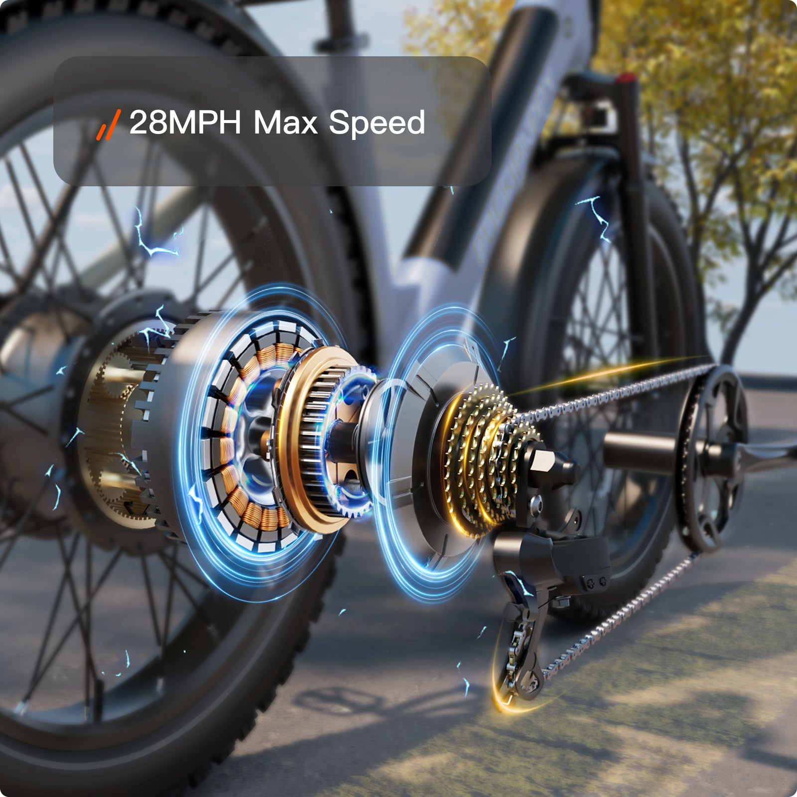 - Powerful 960W Peak Motor: Enjoy responsive acceleration and hill-climbing ability with the 750W rated brushless motor (960W peak). Reach throttle speeds of 20 mph and pedal assistance up to 28 mph for a swift commute.