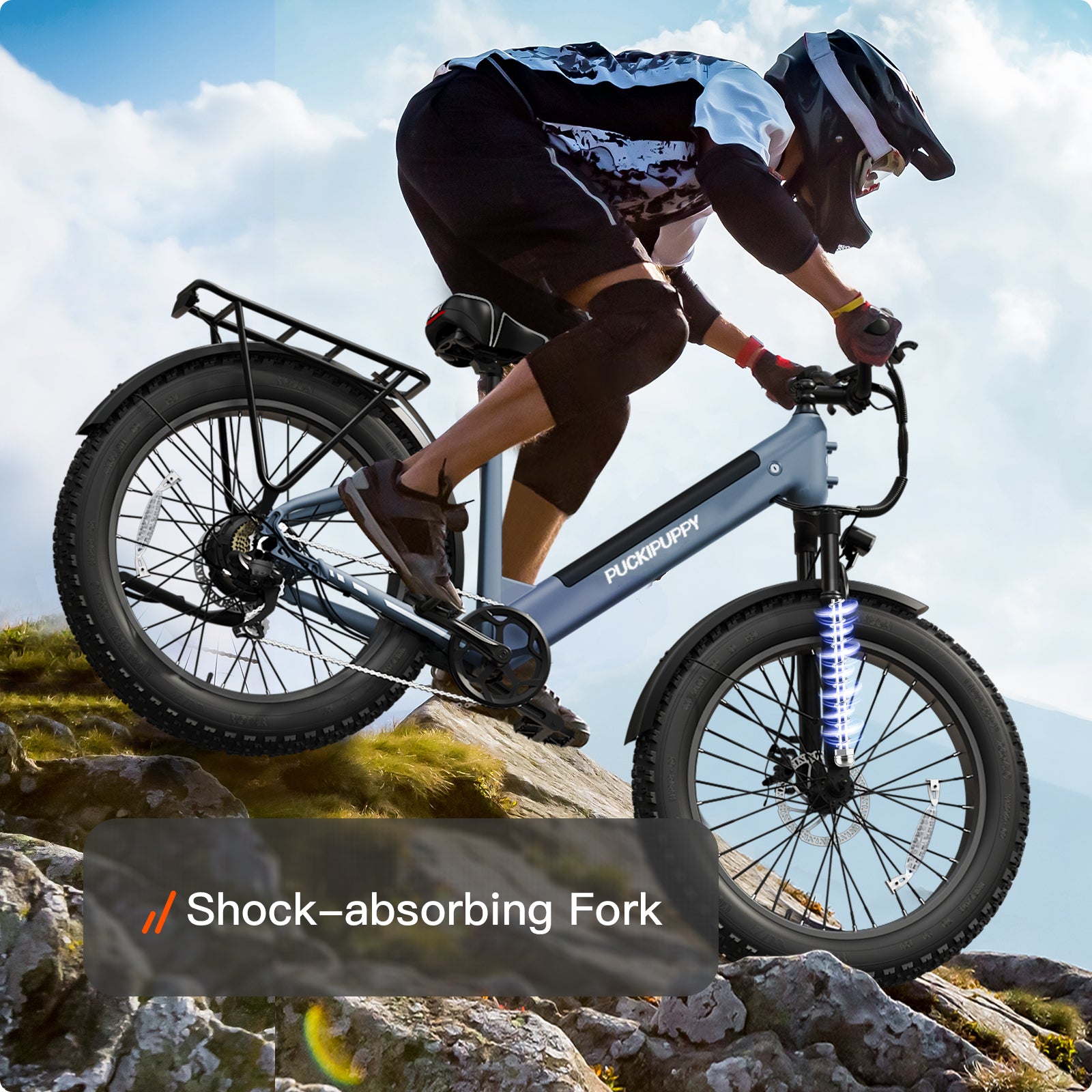 PUCKIPUPPY Samoyed: Your ideal step-through commuter ebike. Featuring an easy-access frame, a powerful 960W peak motor with 28 mph assist, and a UL-certified 60-mile range battery. With 110mm adjustable front suspension and stable 26″ x 4.0″ fat tires, it delivers a smooth, comfortable, and fun ride for your daily commute or leisurely cruises.