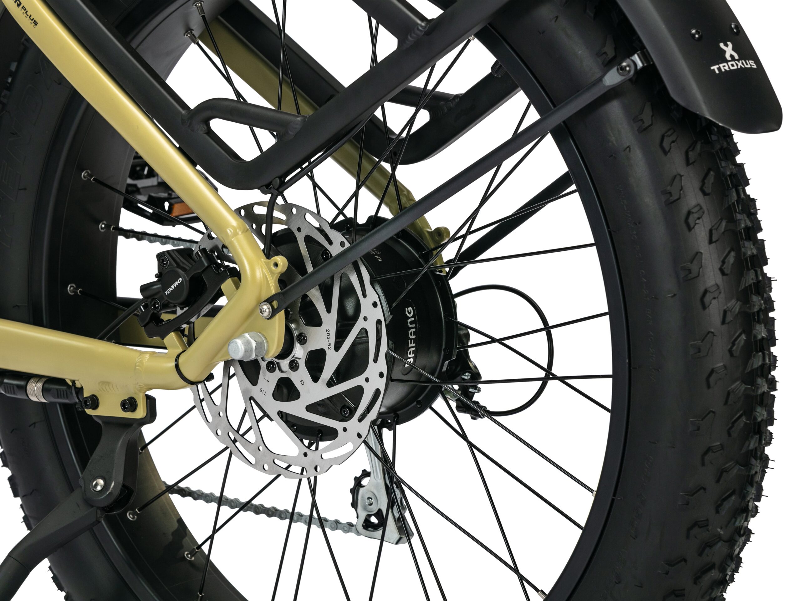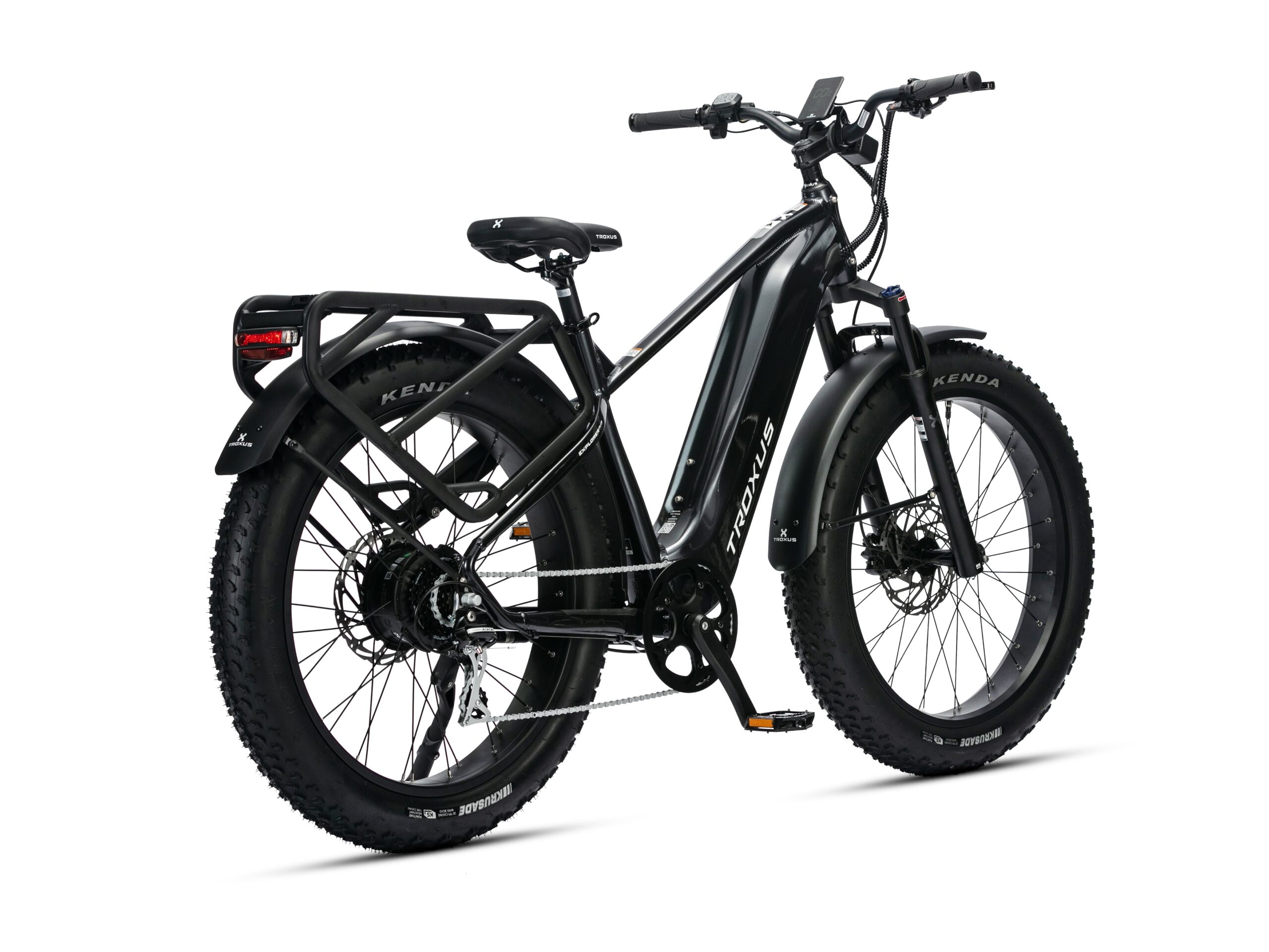 Conquer big adventures with the Troxus Expedition Step-Over fat tire ebike. Powered by a Bafang® 750W hub motor with 86Nm of torque and a 960Wh Samsung® cell battery for up to 90 miles of range. The innovative switchable torque/cadence sensor and Bluetooth color display with integrated turn signals put you in total control. With a MIK-compatible 100 lb capacity rear rack, 4.0″ Kenda® tires, and 400 lb load capacity, it’s built for heavy-duty exploration. Large step-over frame fits riders 5’8″ – 6’4″.