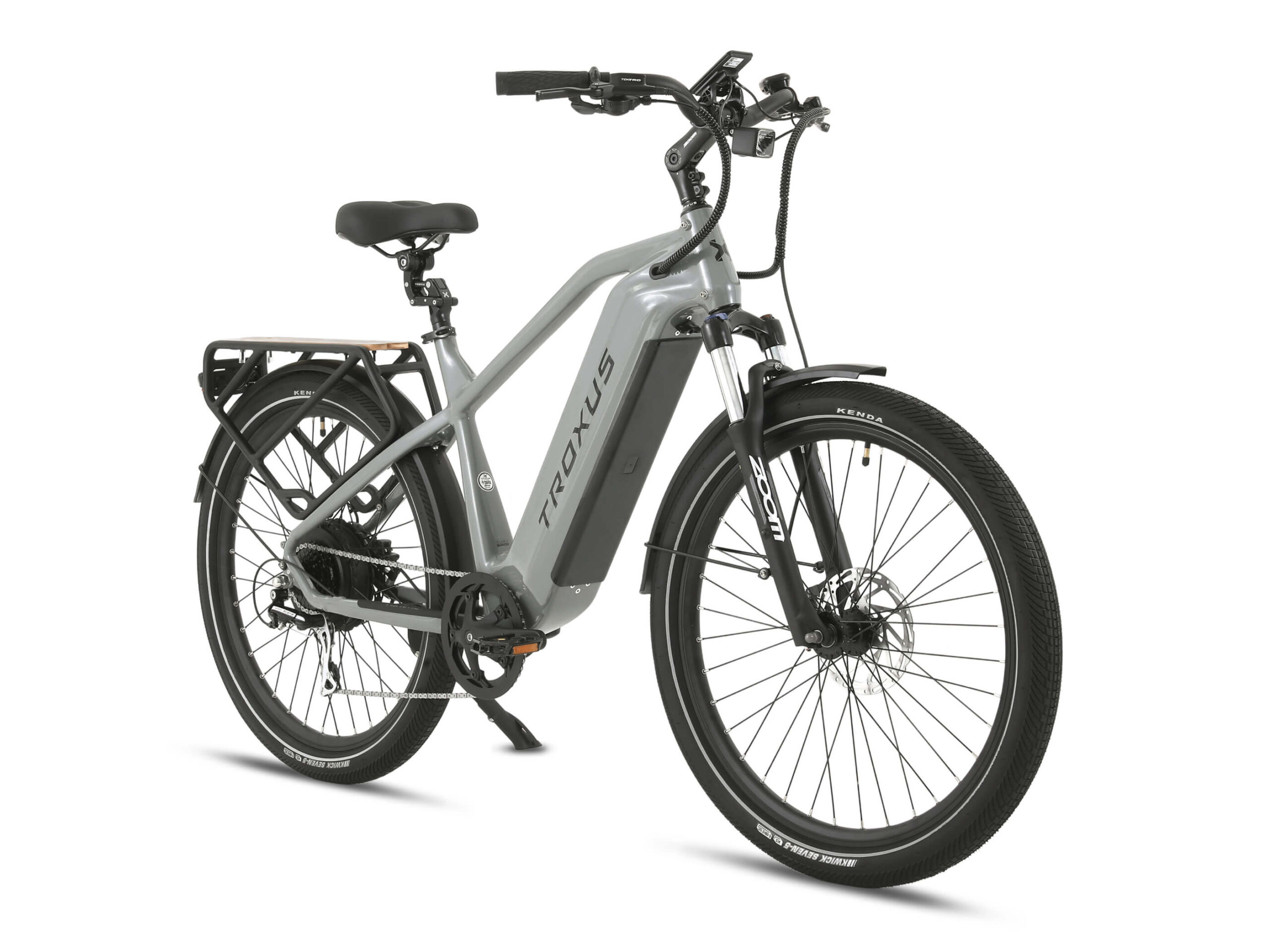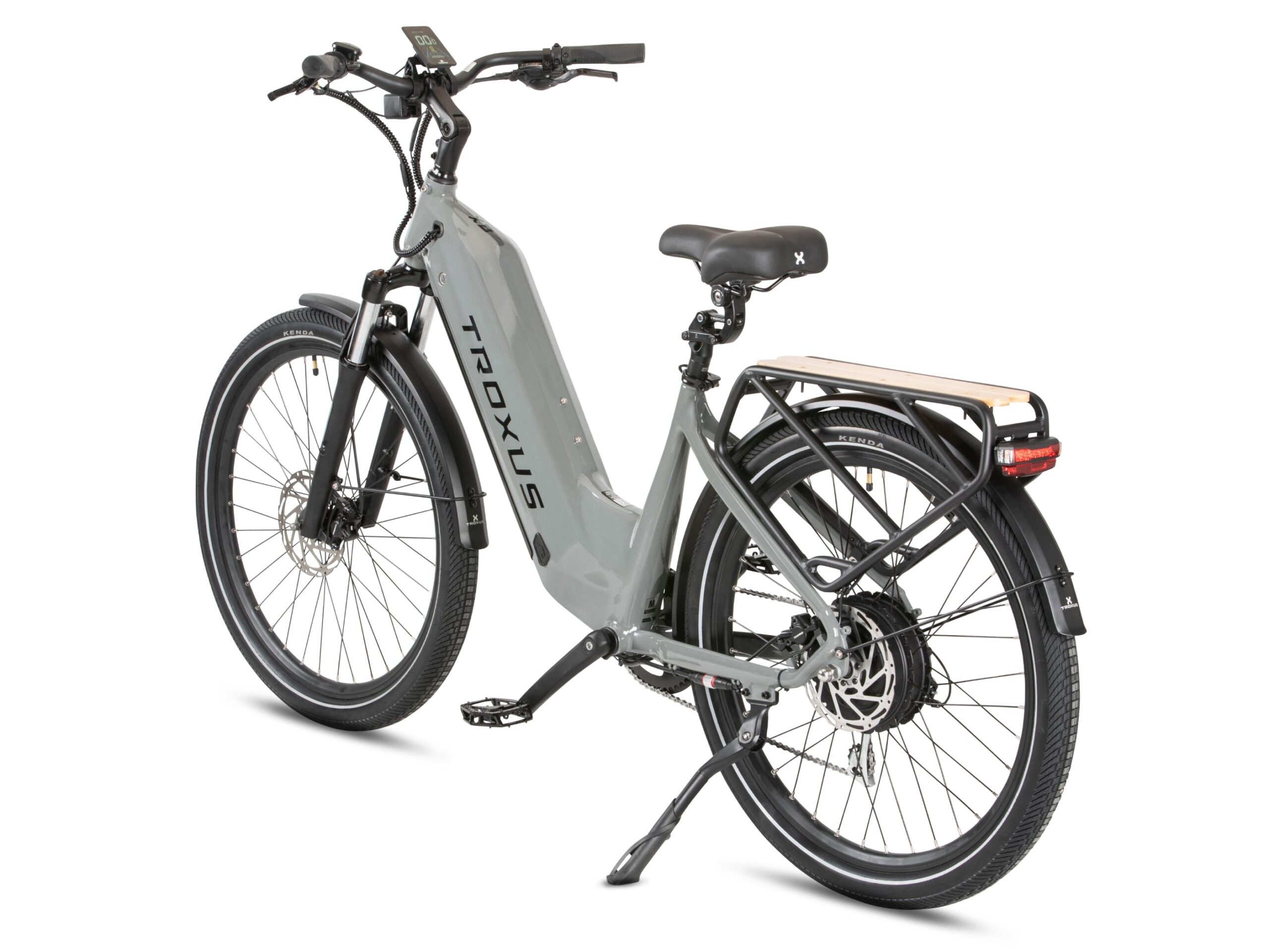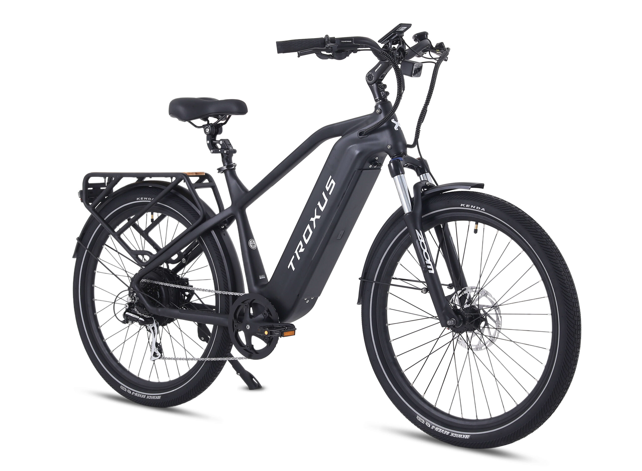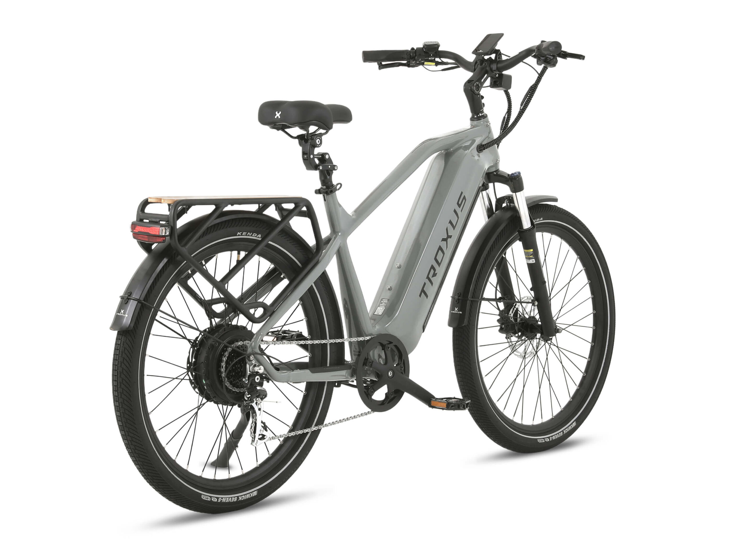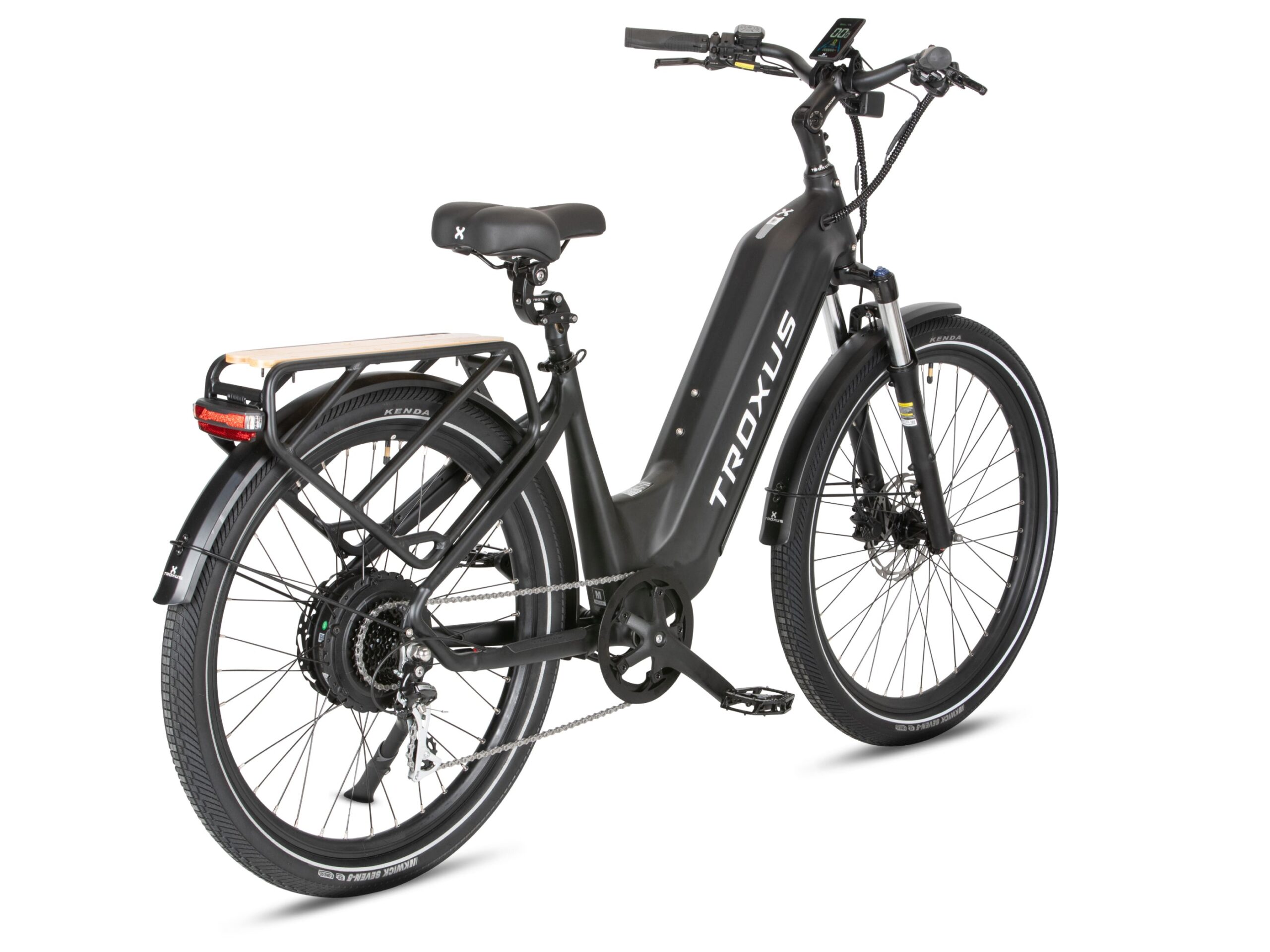 Tektro® hydraulic disc brakes with 180mm rotors provide reliable stopping power, even when fully loaded. Brake sensors cut motor power instantly for an extra layer of safety. The 80 Lux front light illuminates your path, while the KENDA® 27.5″x2.4″ tires feature reflective stripes and puncture-resistant E-50 rated construction for confidence on any surface.